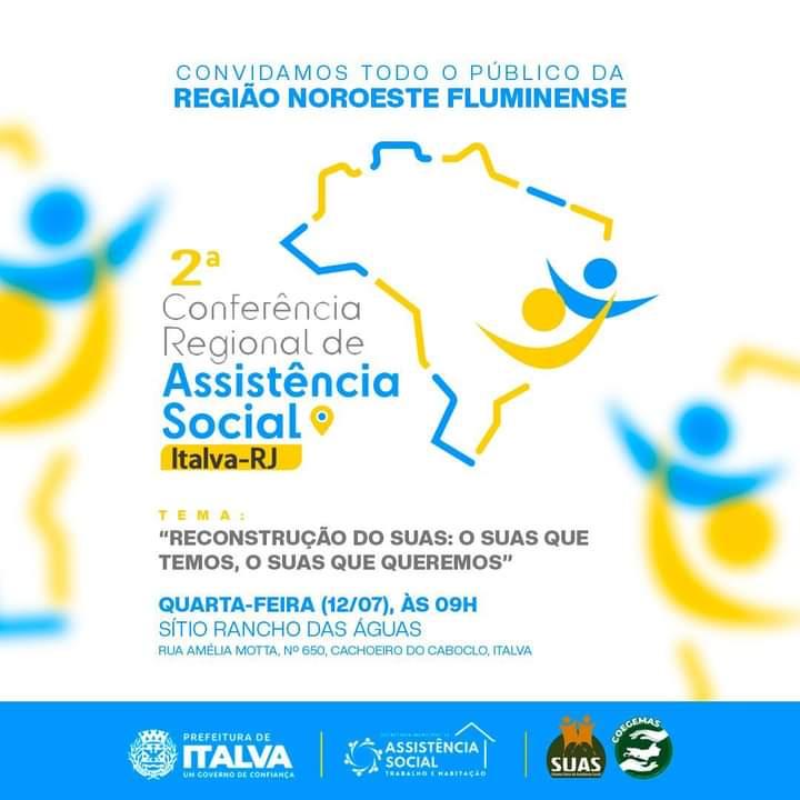 A Secretaria Municipal de Assistência Social, Trabalho e Habitação convida a todos para participarem da Segunda Conferência Regional de Assistência Social da Região Noroeste Fluminense do Estado do Rio de Janeiro, que será sediada no município de Italva no dia 12 de julho (quarta-feira) no Sítio Rancho das Águas.