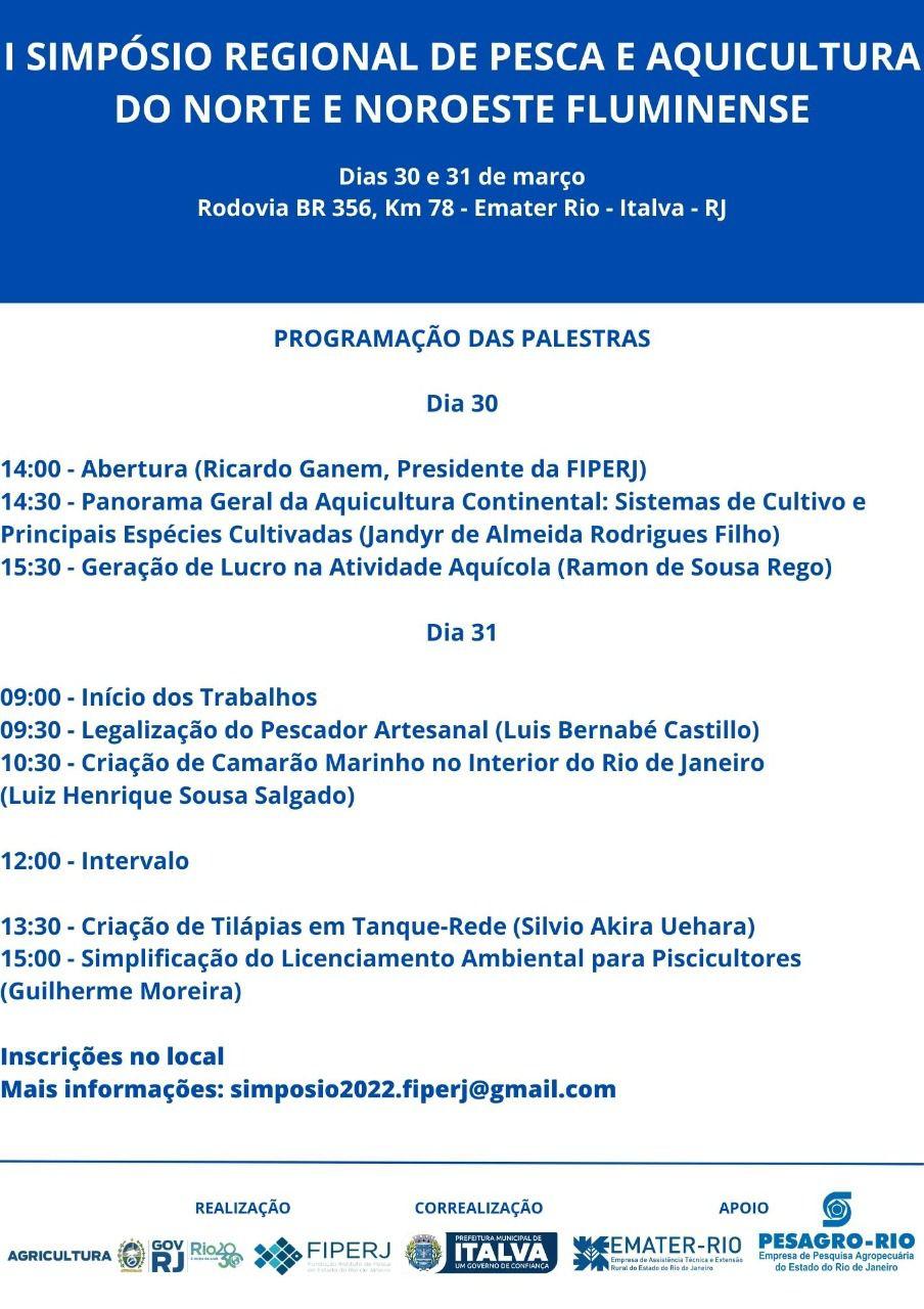 A Fundação Instituto de Pesca do Estado do Rio de Janeiro (FIPERJ), autarquia vinculada à Secretaria de Estado de Agricultura, Pecuária, Pesca e Abastecimento (SEAPPA) promove, nos dias 30 e 31 de março, o I Simpósio Regional de Pesca e Aquicultura do Norte e Noroeste Fluminense. O evento vai ocorrer no Município de Italva, na sede da Emater Rio.Nos dois dias de Simpósio, estão programadas palestras que abordam temas e práticas importantes para os pescadores e aquicultores, em especial, aqueles que atuam no Norte e Noroeste do Estado. Entre os assuntos expostos estão desde aqueles voltados às técnicas de pesca e produção, até aspectos de licenciamento ambiental e geração de renda. Cerca de 100 profissionais são aguardados para o evento.A participação no Simpósio é gratuita, e as inscrições podem ser feitas no próprio local. No dia 30 (quarta-feira), as palestras começam às 14h30, após a abertura feita pelo Presidente da FIPERJ, Ricardo Ganem. Já no dia 31, as atividades têm início às 9h.Realizado pela FIPERJ e pela SEAPPA, com correalização da Prefeitura de Italva, o evento tem apoio da Empresa de Pesquisa Agropecuária do Estado do Rio de Janeiro (Pesagro-Rio) e Empresa de Assistência Técnica e Extensão Rural (Emater-Rio), ambas também vinculadas à Secretaria.“Queremos convidar a todos os pescadores artesanais e profissionais, e também aos aquicultores, a participar desse evento, que irá fomentar, esclarecer dúvidas e incrementar a cadeia produtiva do setor, em especial, no Norte e Noroeste Fluminense”, afirma Ricardo Ganem. “Quero, também, agradecer à SEAPPA e à Prefeitura de Italva, assim como às vinculadas Emater e Pesagro, que não mediram esforços para apoiar nosso evento”.A sede da Emater Rio em Italva fica na Rodovia BR 356, Km 78. Mais informações sobre o Simpósio podem ser obtidas pelo email <simposio2022.fiperj@gmail.com>.Confira a programação completa de palestras:Dia 30