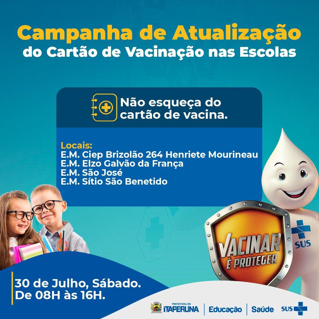 A campanha de atualização do cartão de vacinação nas escolas acontece no próximo sábado, 30 de julho, das 8h às 16h. Acompanhe as notícias sobre a Secretaria Municipal de Saúde e demais secretarias pelas redes sociais da Prefeitura de Itaperuna!